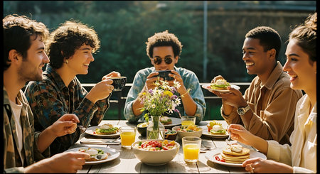 A group of friends enjoying brunch at a restaurant, featuring avocado toast with poached eggs in the foreground, laughter and conversation, warm sunlight