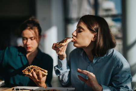 Two women enjoying pizza during a casual lunch break