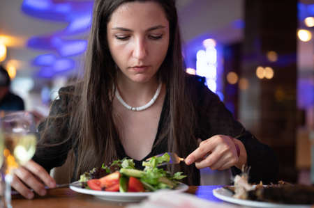 Dinner at a restaurant. A woman eats an eggplant and cheese salad with appetite. Close-up.