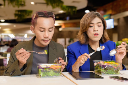 Gender diverse Asian coworkers eating salad and working digitally