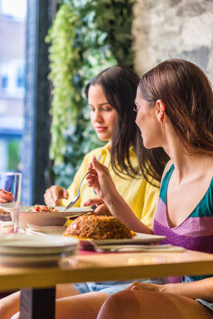 Latinx female friends together eating happy in a Ecuadorian food restaurant. Traditional meal