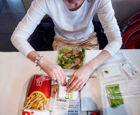 Chatte, France - Aug 11, 2017: View from above of curious impatient woman eating multiple junk food products at McDonalds Restaurant