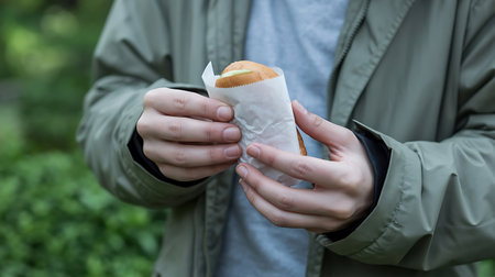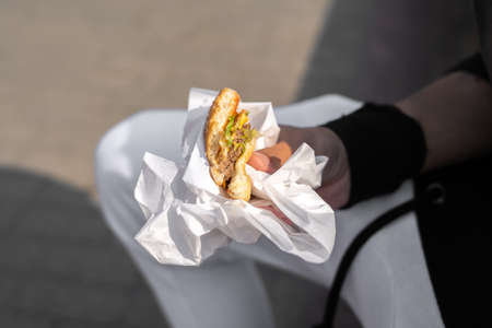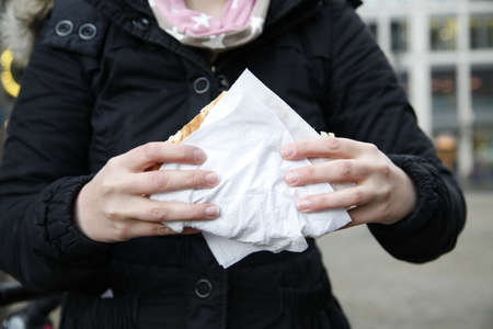 wafer holding in hands, american take-away meal.