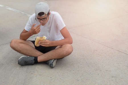young man eating a bread and tortilla sandwich with a potato sitting on the asphalt floor with a cap to protect him from the sun on a summer day