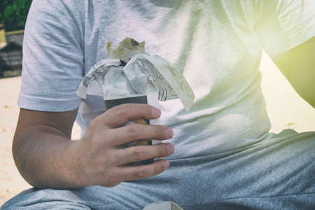 Good-looking and attracive tourist is sitting on the big white steps. He is eating a burger with his right hand and looking to the map which he is holding with his left hand. He is searching an interesting place to visit. Close up. Cut view