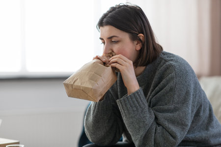 woman having panic attack breathing to bag at home