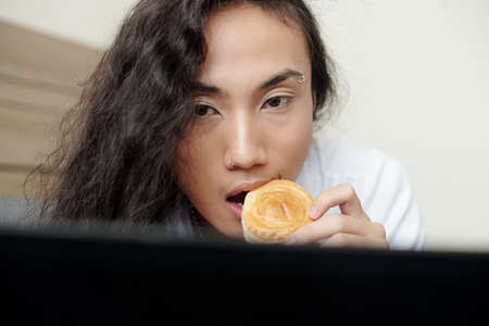 Face of pensive young man with long curly hair eating sweet homemade pastry and reading interesting article on laptop screen