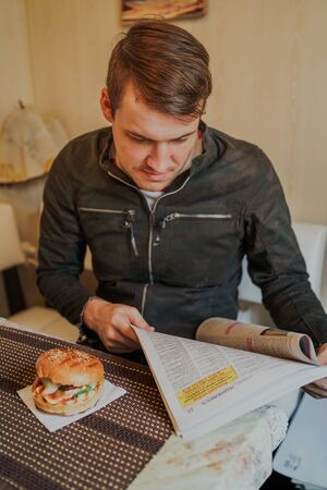 A concentrated young man in a cap and orange sweater is reading a book and eating a burger at a fast food restaurant. Funny student with a serious face is studying for a break and eating fast food.