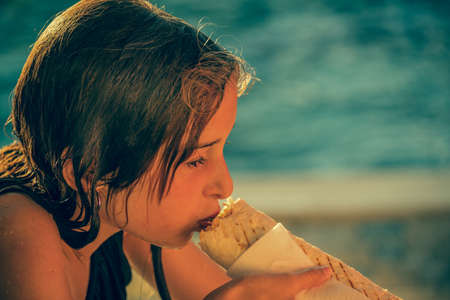 The girl eats shawarma on the street. Fast food. Close up portrait of hungry girl is eating fast street junk food. Young teenager biting tasty yummy shawarma, outdoor. Extra calories, overeating.