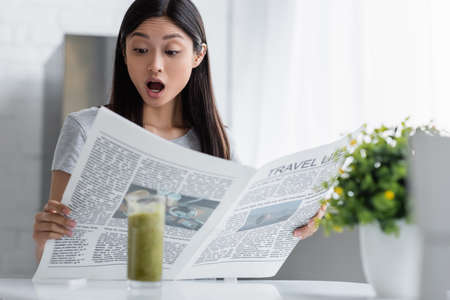astonished asian woman reading travel life newspaper near blurred glass with smoothie