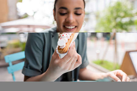 Blurred smiling african american client holding eclair on terrace of sweet shop