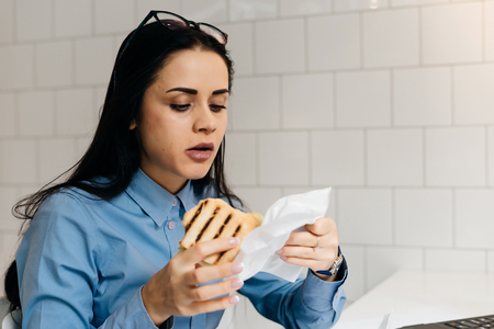 young beautiful brunette girl eating a sandwich at a cafe