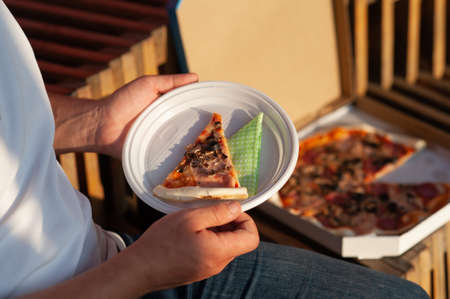 A man holds a slice of pizza in his hands. Fast food in the fresh air
