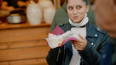 Smiling young woman presents sample at lively market stall