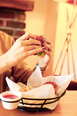 Woman holding hamburger in fast food restaurant.
