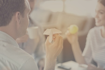 Positive thinking. Inspirational typographic quote for stay connected with two colleagues having fun while playing with paper plane and tennis ball in a background