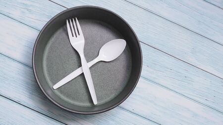 Disposable tableware plates and spoons. Plastic contaminates the earth and water. Concept of environmental pollution. Top view.