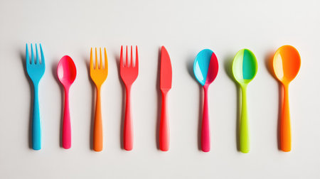 Set of brightly colored plastic utensils, including forks, spoons, and knives, placed in a neat arrangement on a plain background.