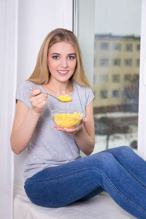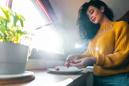 Young woman eating healthy breakfast in the morning at home. Healthy lifestyle concept.
