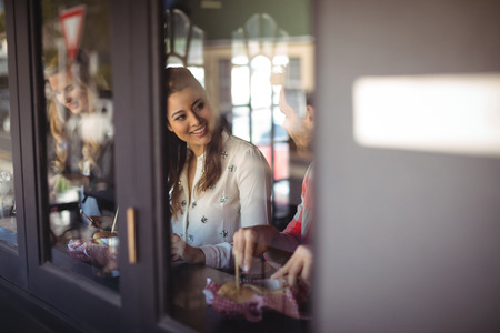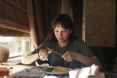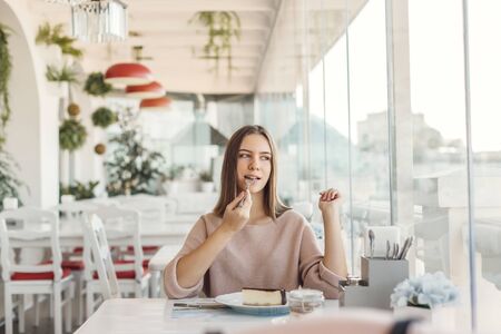 Cute teen girl eating tasty dessert while spending time in bright cafe
