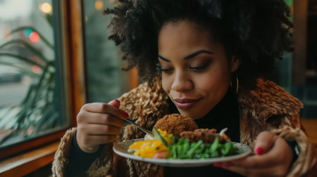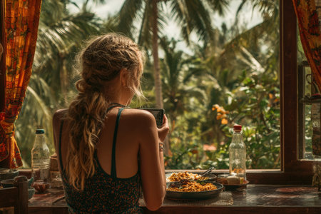 Female diner savoring coconut rice at a wooden table, with vibrant greenery outside the window, creating a peaceful and inviting atmosphere for enjoying food
