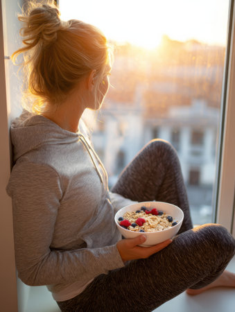 A woman relaxes by a window, holding a bowl of oatmeal topped with berries as she enjoys the morning sunlight and views of the city.
