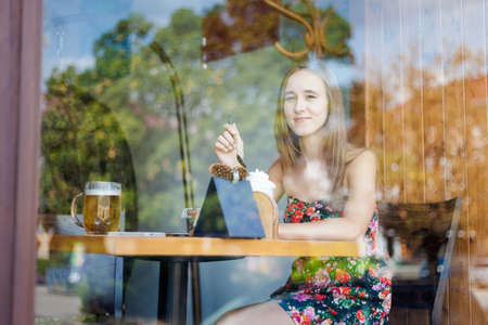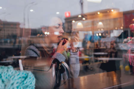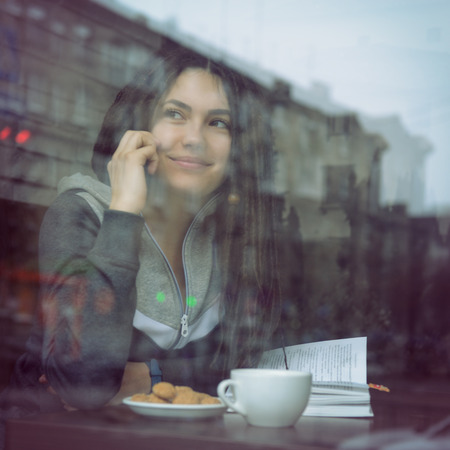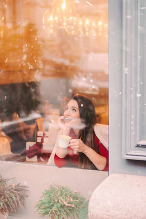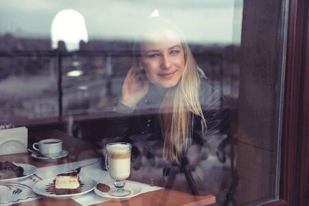 Young woman at the restaurant. Adult dreaming girl looking through window.
