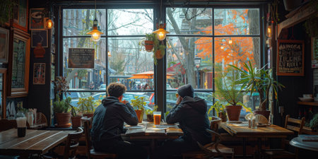 A solitary individual is seated at a cafe window, gazing out at a bustling city street. Natural light filters in, illuminating the indoor plants and inviting atmosphere.