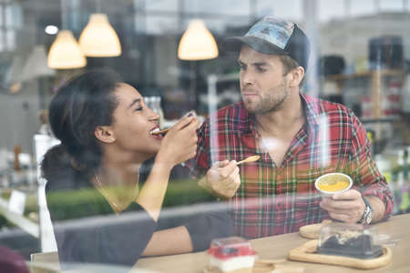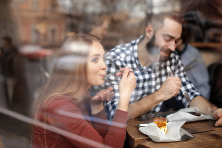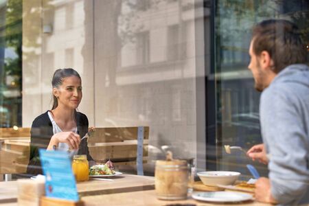 Lovely young couple spending time together in cafe, view from outdoors through window