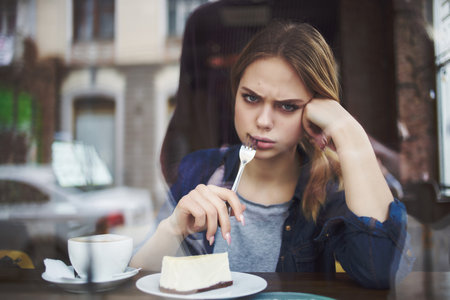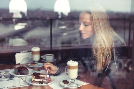 Nice female in cafe eating cake and drinking latte in warm cozy atmosphere, enjoying sweet tasty dessert, casual urban life of young people
