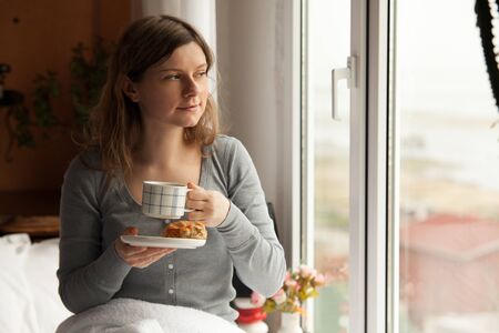 Nice female in cafe in warm cozy atmosphere, enjoying view through the window, casual urban life of young people