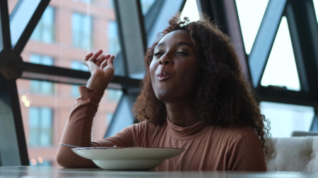 Such delicious tasty filling food. Close-up of a curly-haired beautiful woman tasting food in a new restaurant.