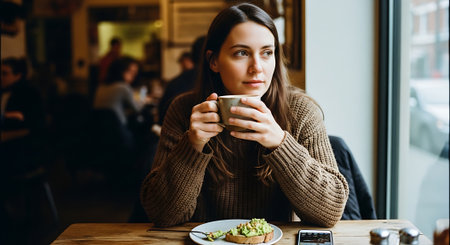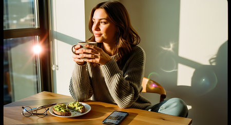 A woman sits by a window, holding a cup of coffee and smiling, with a plate of avocado toast, glasses, and a phone on the table in front of her.