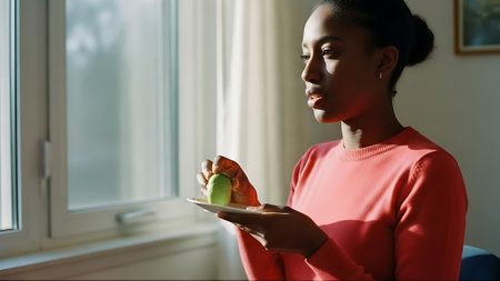 A joyful young woman delights in a nutritious salad while sitting by the window, showcasing a vibrant and healthy lifestyle in a cozy setting.