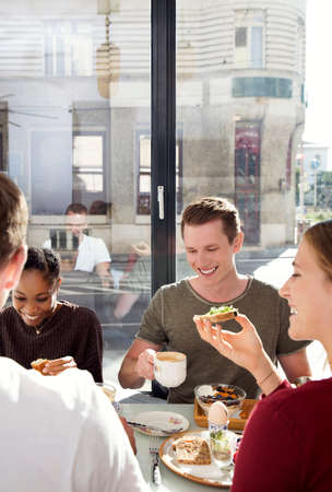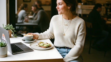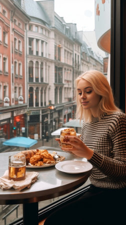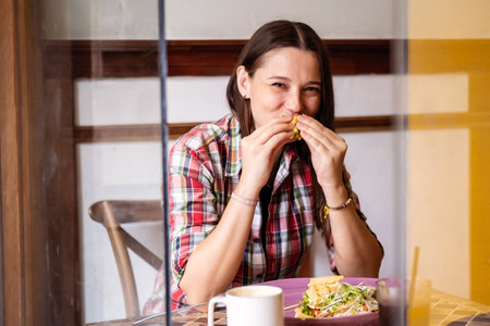 Young woman sitting in a cafe, drinking coffee and eating sandwich.