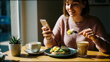 Young woman using mobile phone while having breakfast in cafe. Female using smartphone.