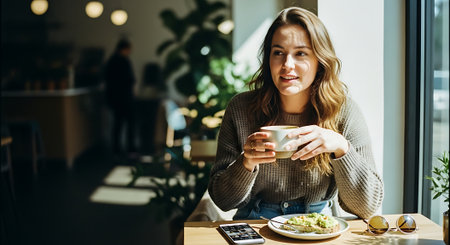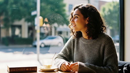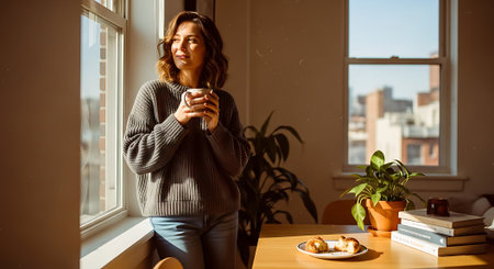 woman drinking coffee by the window, in the style of serene faces, weather core, joyful and optimistic