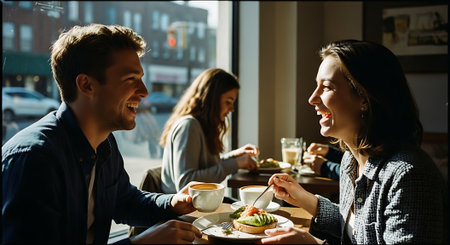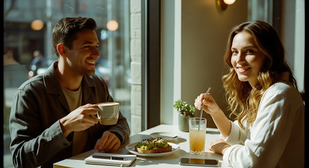A smiling man and woman sit at a table, engaged in conversation while enjoying their meal and coffee in a bright and airy cafe setting.