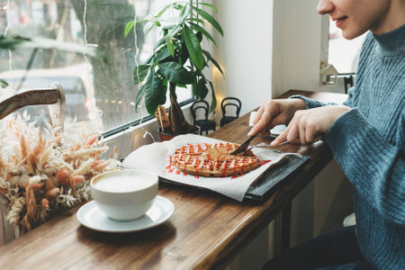 The girl cuts a waffle with chocolate and fruit syrup and is going to eat.