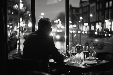 Man sitting at a table in a restaurant at night. Black and white photo.