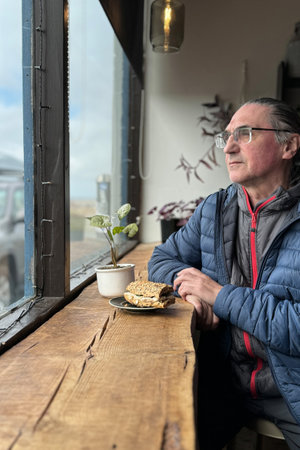 View through a frosted window frame of a man's silhouette sitting at a table inside a warm room. He holds a mug, looking out at the cold winter landscape, creating a cozy contrast.