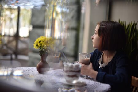 Little girl drinking hot chocolate in a cafe. schoolgirl drinks cocoa in a cafe. girl after classes in a coffee house drinks cocoa and eats a dessert. A girl is sitting by the window. Back to school