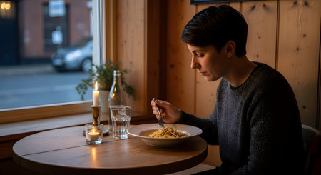 A young woman eats a plate of pasta alone at a wooden table by a window in a cozy restaurant. The soft candlelight and her contemplative expression suggest a quiet, solitary dining experience.