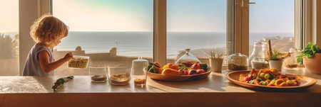 A little girl sitting at a table with a bowl of food. Generative AI image.