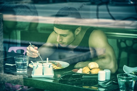 Handsome young man having meal in cafe or diner, overhead perspective. Seen from above