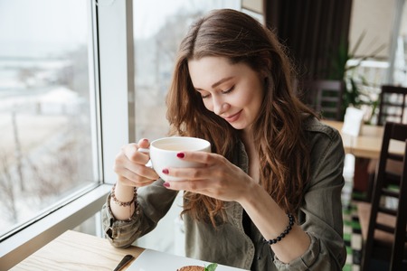 Beautiful young woman is drinking coffee and smiling while sitting in cafe