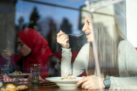 A young woman in a cafe dines on traditional shakshuka and ayran.