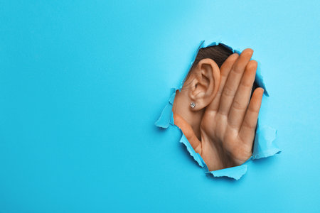 Woman showing hand to ear gesture through hole in light blue paper, closeup. Space for text