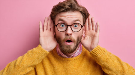 A man with glasses and a beard expresses his surprise by widening his eyes and placing his hands near his ears. He wears a yellow sweater and is against a pink backdrop.