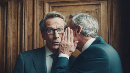 In an elegant wood-paneled room, a businessman discreetly whispers a crucial detail into his boss's ear, capturing a moment of professional intrigue.